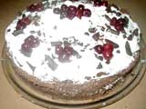Ингредиенты: 100 г сливочного масла или маргарина 100 г сахара 60 г муки 40 г крахмала 1/2 ч. л. молотой корицы 2 полные ч. л. разрыхлителя 4 яйца 75 г мелко натертого черного шоколада 25 г порошка какао 75 г мологого миндаля для начинки: 400 г вишни без косточек (консервированной) 500 г сливок 1 пакетик ванильного сахара для украшения: 60 г шоколадной стружки Инструкции: Масло или маргарин взбить с сахаром до получения густого пышного крема. Смешать муку с крахмалом, корицей и разрыхлителем. Вместе с яйцами ввести в сливочный крем. Порциями добавить черный шоколад, порошок какао и миндаль. Предварительно нагреть духовку до 180 градусов. Форму смазать тонким слоем масла и посыпать мукой. Наполнить тестом и разровнять его. Выпекать в духовке около 35 минут. Опрокинуть бисквит из формы на решетку для пирога и полностью охладить его. Остывший бисквит разрезать горизонтально на 3 коржа. Аккуратно слить с вишни сироп. Сливки с ванильным сахаром тщательно взбить в густую пену.Тонким слоем нанести 1/3 сливок на нижний корж. Сверху аккуратно выложить половину вишни. Накрыть вторым бисквитом, аккуратно намазать тонким слоем сливок. От оставшейся вишни отложить 12 ягод, а остальные выложить поверх сливок. Накрыть третьим коржом. 3 ст. ложки сливок положить в кондитерский мешочек с звездчатым наконечником. Обмазать торт оставшимися сливками. Украсить середину торта розочками из сливок, расположив их по кругу, внутрь которого положить отложенные вишни. В заключение посыпать край шоколадной стружкой.