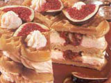 Ингредиенты:(на 4 порции) 4 яйца 350 г сливочного масла 150 г сахара 1 яблоко 125 г муки 1 ч. л. разрыхлителя 50 г рубленого миндаля 175 мл молока 1/2 ч. л. молотой корицы 1 пакетик ванильного сахара 4 ягоды инжира Способ приготовления: Яблоко натереть на терке. 2 желтка растереть с 100 г сливочного масла и 50 г сахара. Добавив яблоко, муку, разрыхлитель, миндаль, молоко и корицу, замесить тесто. Взбить 2 белка и ввести в тесто. Испечь 3 вафли. Для крема взбить 2 яйца, 100 г сахара, ванильный сахар и 250 г сливочного масла. Один инжир нарезать дольками, а остальные - кубиками. На 2 вафли выдавить по 2 кольца крема, распределить кубики инжира. Положить одну на другую и накрыть третьей вафлей. Украсить кремом и дольками инжира.