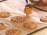 Овсяное печенье | Вам потребуются: овсяные хлопья - 1 стакан; мука -1 стакан; сахар - 1/2 стакана; мед - 1/2 стакана; сметана - 1/2 стакана; яйцо - 1 шт.; масло - 100г; сода - 1/2 ч. л. Растопленное сливочное масло растереть с сахаром до бледно-желтого цвета. Продолжая размешивать, добавить мед и сметану. Добавить яйцо и еще раз перемешать. Далее прибавить к получившейся массе овсяные хлопья. В муку добавить соду, просеять через сито и смешать с хлопьями. После все вымесить в течение нескольких минут, чтобы получилось достаточно густое тесто. Противень выстелить бумагой для выпечки, смазать ее маслом. Столовой ложкой выложить на противень лепешки из теста, оставляя интервалы не менее 5 см, т.к. в процессе выпечки печенья увеличатся. Выпекают печенье при температуре 200-220С до золотисто-коричневого цвета. |