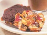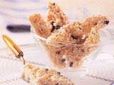 Печенье с изюмом |  Ингредиенты: На 18 штук: 300 гр блинной муки 1/4 ч л молотой корицы 90 ге сливочного масла 75 гр сахара 160 гр изюма 2 ч л цитрусовой цедры (лимонной и апельсиновой) 1 яйцо 125 мл молока 1 ч л сахара Инструкции: Разогреть духовку до 200 гр С. Соединить муку и корицу в большой миске, втереть масло, добавить сахар и цедру. Добавить яйцо и молока столько, чтобы получилось густое тесто. Ложкой выкладывать тесто на противень на расстоянии 5 см. Посыпать сверху сахаром. Запекать в духовке около 15 мин до коричневого цвета. Дать остыть на противне. |