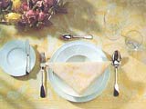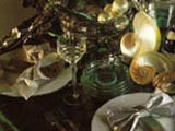 Сервировка праздничного стола |  За несколько дней до праздника оцените арсенал своего буфета и решите какую посуду вы хотели бы видеть на вашем праздничном столе. Представление о том, что для праздничного ужина стол сервируют белой посудой и серебром, уже давным-давно устарело, и сейчас существует множество вариантов, однако бокалы, посуду и приборы следует по возможности подбирать по цвету. Под выбранную посуду подберите скатерть. Скатерти пастельных тонов или подходящие к посуде салфетки сейчас можно купить повсюду. Сюжет на однотонной скатерти можно вышить и самой. Как вариант можно взять черную муаровую скатерть, которая в сочетании с золотистыми и серебряными украшениями и соответствующим фарфором выглядит довольно благородно. |