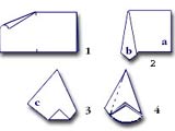 Оформление салфеток 1 |  Копье с манжетом (французская салфетка, шляпа, кулек). Салфетку сложить открытыми сторонами к низу (1). Наметить середину и левую половинку завернуть к середине (1). Уголок "a" уложить на угол "b" и все 4 кончика салфетки заломать кверху (3). Угол "c" ставится свободно, слегка разворачивается (4). Салфетке придают устойчивую форму, слегка округляя и устанавливая стоя. |