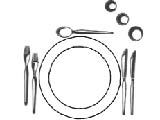 Глубокая тарелка стоит для основного блюда. Десертная тарелка подается позже по мере необходимости. Столовые приборы расположены таким образом, чтобы не запутаться в их применении: нож и вилка лежат рядом с главным блюдом и, соответственно, предназначены для него. Десертная ложечка лежит за тарелкой черенком направо. Если подается сок, то справа за ножом стоит соответствующий бокал для сока. . Если подается несколько напитков соки, вода остальные бокалы должны стоять там же. В данном случае глубокая тарелка, предназначенная для спагетти, стоит на большом блюде-подставке. С итальянскими блюдами обязательно подается тарелка для хлеба. Спагетти кушают при помощи ложки и вилки, поэтому нож заменяют на соответствующий прибор, десертная ложечка лежит так же, как и в предыдущем случае, а нож для масла лежит на тарелке для хлеба. С итальянскими блюдами всегда подается вода, соответственно бокал для воды (минеральной, например) должен стоять на первой позиции, ближе к блюду. Бокал для вина располагается слева сверху за бокалом для воды. Столовые приборы раскладывают сразу после расстановки тарелок. Если присутствует большое количество ножей, вилок и ложек, то начинают с приборов для главного блюда. Ножи кладут с правой стороны, лезвием к тарелке, вилки – с левой стороны, острием вверх. Ложку для супа кладут носиком вверх, рядом с ножом. Если в меню предусматривается несколько блюд, требующих использования отдельных приборов, то поступают следующим образом. Ближе к тарелке кладется столовый нож, правее рядом с ним закусочный нож. Кстати говоря, если подают сливочное масло к хлебу, то на тарелку для хлеба (или пирожковую), которая должна располагаться слева от вилки, кладут маленький нож для масла. Если подается суп, то ложка для супа кладется между закусочным ножам. С левой стороны от тарелок располагают соответствующие ножам вилки – столовую, закусочную. Расстояние между приборами должно составлять немного меньше 1 см, равно как и расстояние между тарелкой и приборами. Концы ручек приборов так же, как и тарелки должны отстоять от края стола на 2 см. Теперь очередь стеклянной (хрустальной) посуды. Для каждого напитка существует свой предмет сервировки. Если предполагается подать только воду, то за каждой тарелкой, в центре или чуть правее ставят фужер или бокал. Он должен располагаться на линии пересечения верхнего края тарелки с концом первого ножа.При нескольких предметах для напитков, фужер смещают левее от центра тарелки, а рядом с ним правее выстраивают на одной линии остальные предметы. Но ставить в одном ряду более трех предметов не принято. При полной сервировке предметы для напитков выстраивают в два ряда. Расстояние между предметами должно быть не менее 0,5-1 см.
