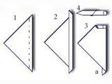 Оформление салфеток 2 | Свеча: Салфетку сложить по диагонали треугольником открытой стороной вверх (1), заломать снизу вверх полосу шириной 2 см (2) и свернуть трубочкой всю салфетку справа налево (3), а наружу выступающий уголок "a" вложить с паз нижней полоски салфетки (4). Такую "свечу" можно установить в нарядном новогоднем салфеточном колечке. |